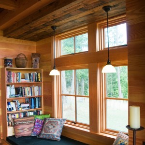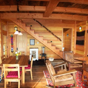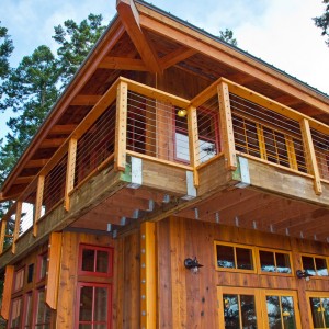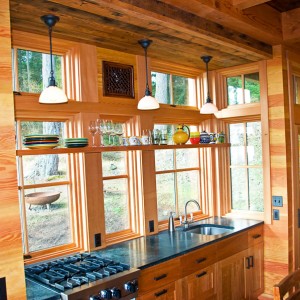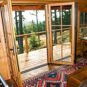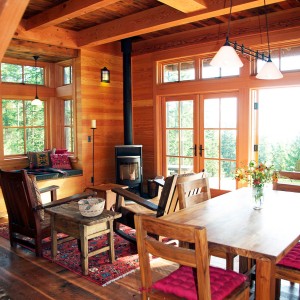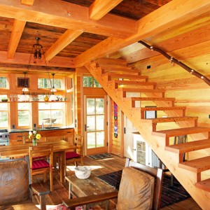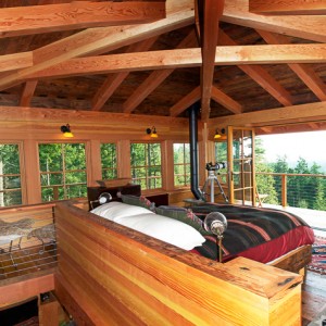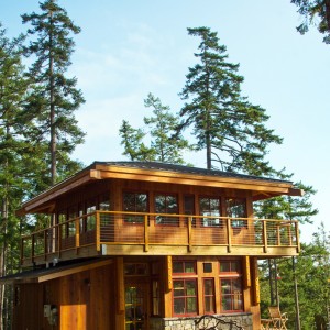 Situated in the highlands and surrounded by tall Douglas firs, this forestry lookout tower design incorporates panoramic vistas through wrap-around windows and an opening glass wall. A timber frame cultivated from reclaimed beams is accented with history ridden car decking and heavy textured flooring. With just under 900 square feet, this cozy cabin is powered by solar panels that back feed the grid when not in use. The exterior siding was re-sawn into shiplap from old power poles and accented by weighty deck corbels and stone clad pop-outs. Truly a gem in San Juan Islands.