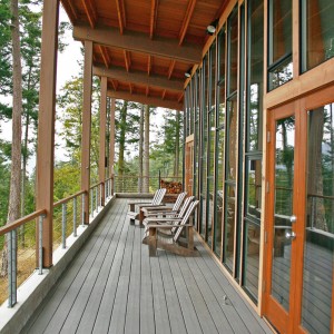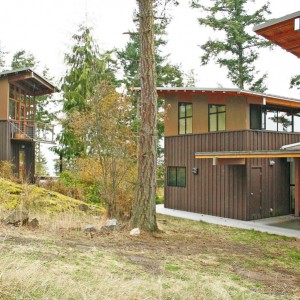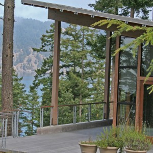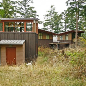 Built into a rugged hillside overlooking Thatcher Pass, this secluded island family retreat includes a spacious main house and fully equipped guest accommodations. The two buildings pair well and are adjoined by simple walkways. Facing the water, the north side of the main house features a floor to ceiling glass wall, integrating interior and exterior elements. One of the biggest challenges for a remote building site such as this is ensuring safe delivery of valuable finish materials. This home was designed by Seattle based architects Miller Hull Partnership.