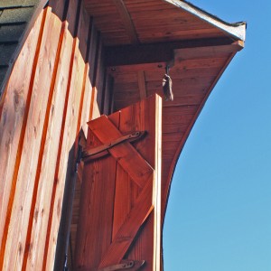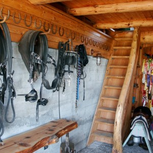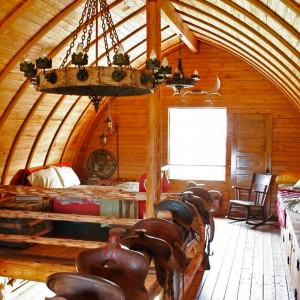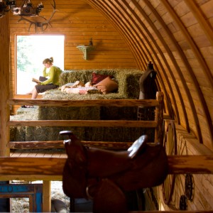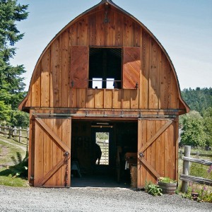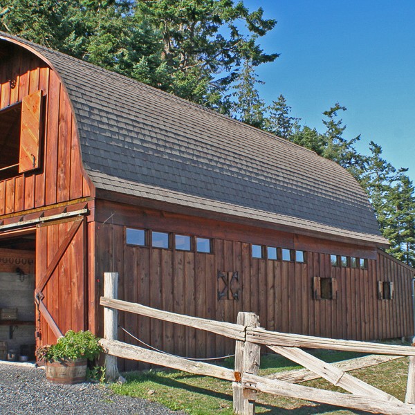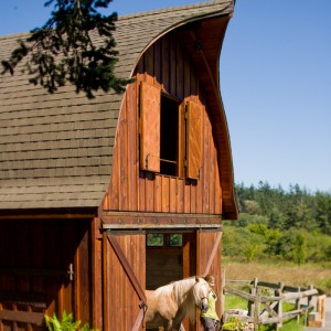 This project was about salvaging an interesting concrete foundation that was poured in 1910. The long, low and dark building served as a root house, where a family of island pioneers stored their harvested goods. A totally new, light filled structure was created while altering very little of the building footprint. A framework of massive logs now supports a gothic style barn roof and loft space. Cutting the ancient, beach gravel cement allowed the addition of large sliding doors at either end of the building. Locally milled fir siding conceals the old exterior of the structure while the interior walls and floor reveal its history. The barn now provides interior and exterior stall space for the family horse while providing luxury sleeping accommodations for overflow guests.